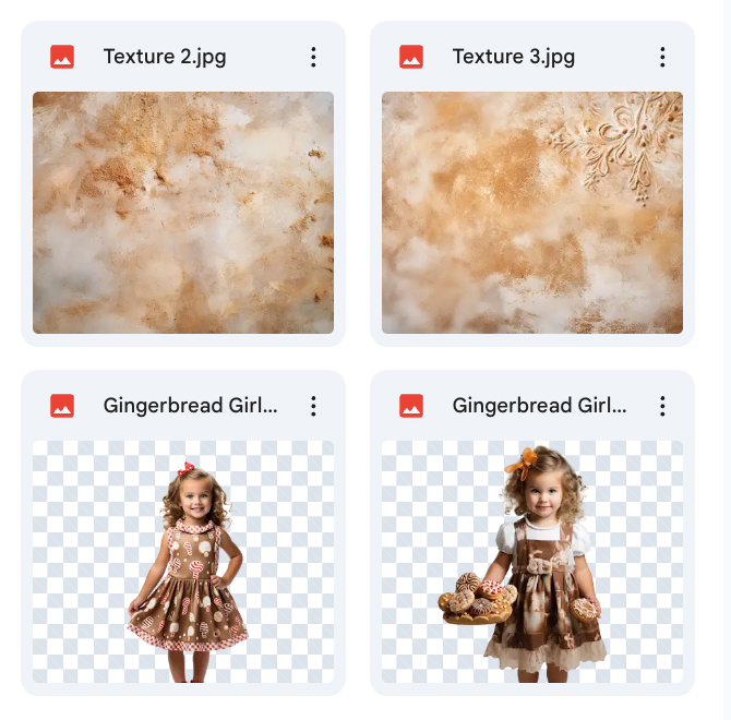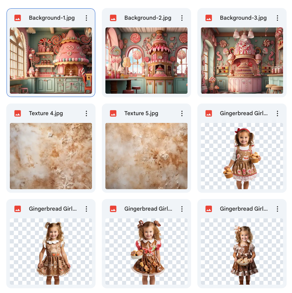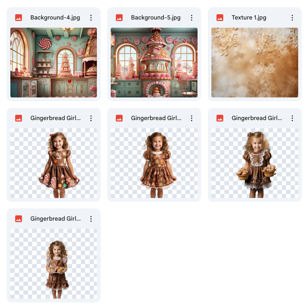 Whimsical Backgrounds: The Gingerbread Kitchen Bundle provides 5 enchanting backgrounds that transport your subjects into a magical gingerbread kitchen, adding a touch of wonder and imagination to your composite photography.