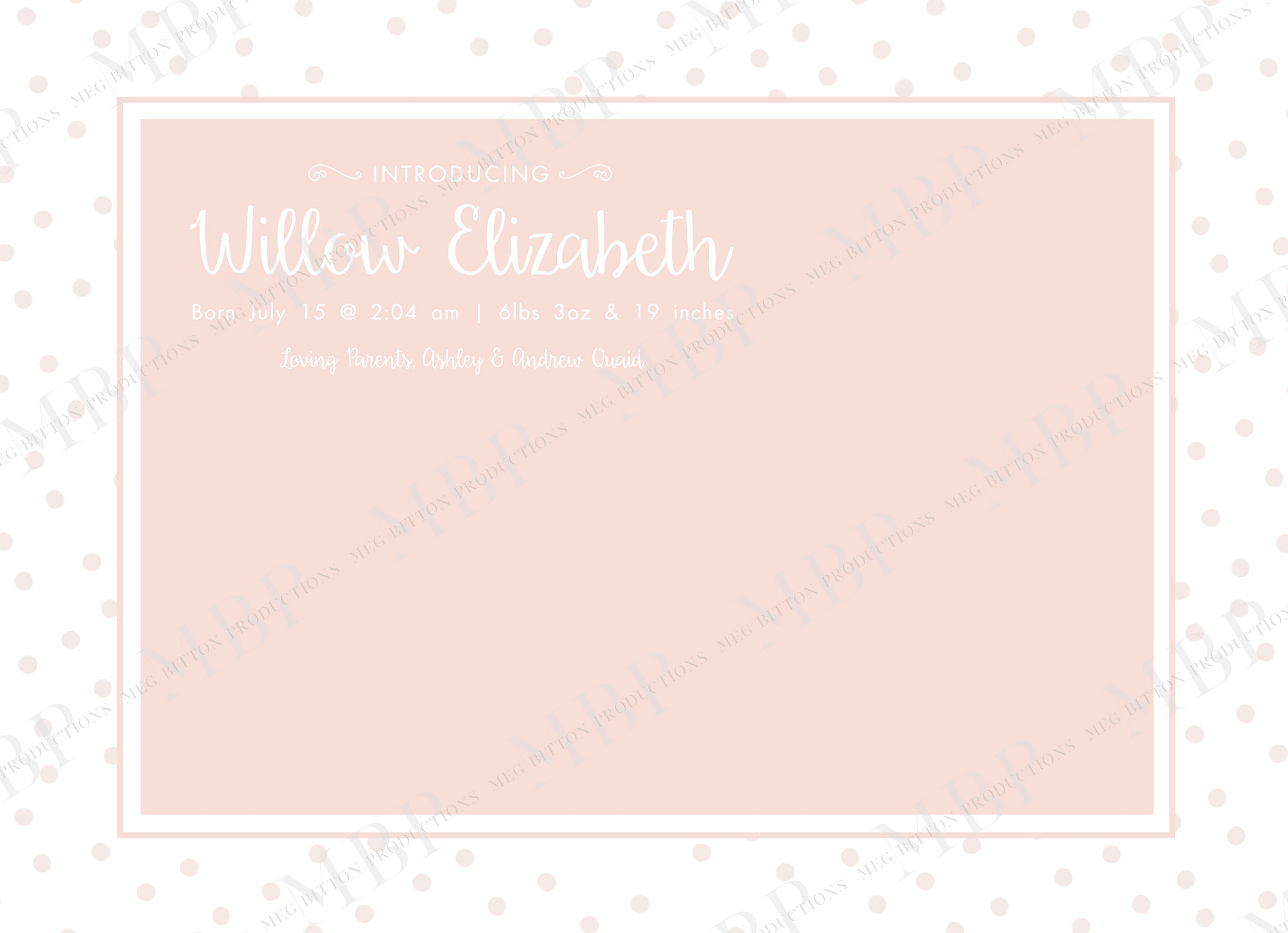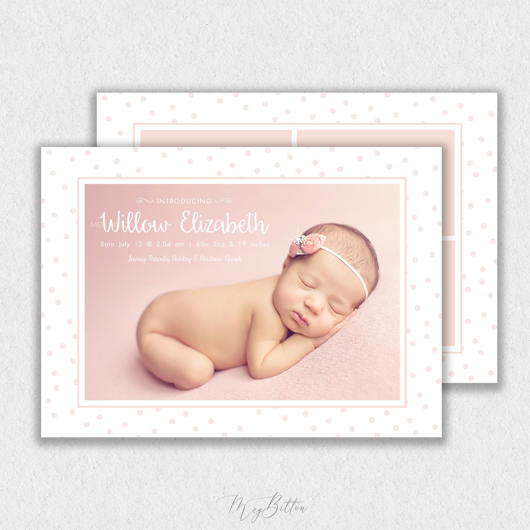 Introducing our beautifully designed Birth Announcement Template, a .PSD file perfect for creating stunning announcements to celebrate the arrival of new life. This template is fully customizable, allowing you to effortlessly add personal touches and make each announcement unique for your clients. With easy-to-use layers and high-quality design, it provides a professional and polished look that new parents will cherish forever.