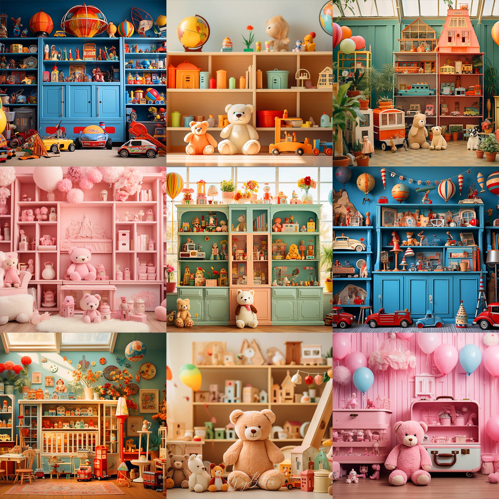 Transform your photo shoots with the Ultimate Toy Room Background Bundle, featuring 100 whimsical toy room digital backgrounds. Perfect for photographers, this collection offers vibrant, playful scenes that ignite imagination and joy. Create captivating, memorable images effortlessly with this versatile, high-quality background set.
