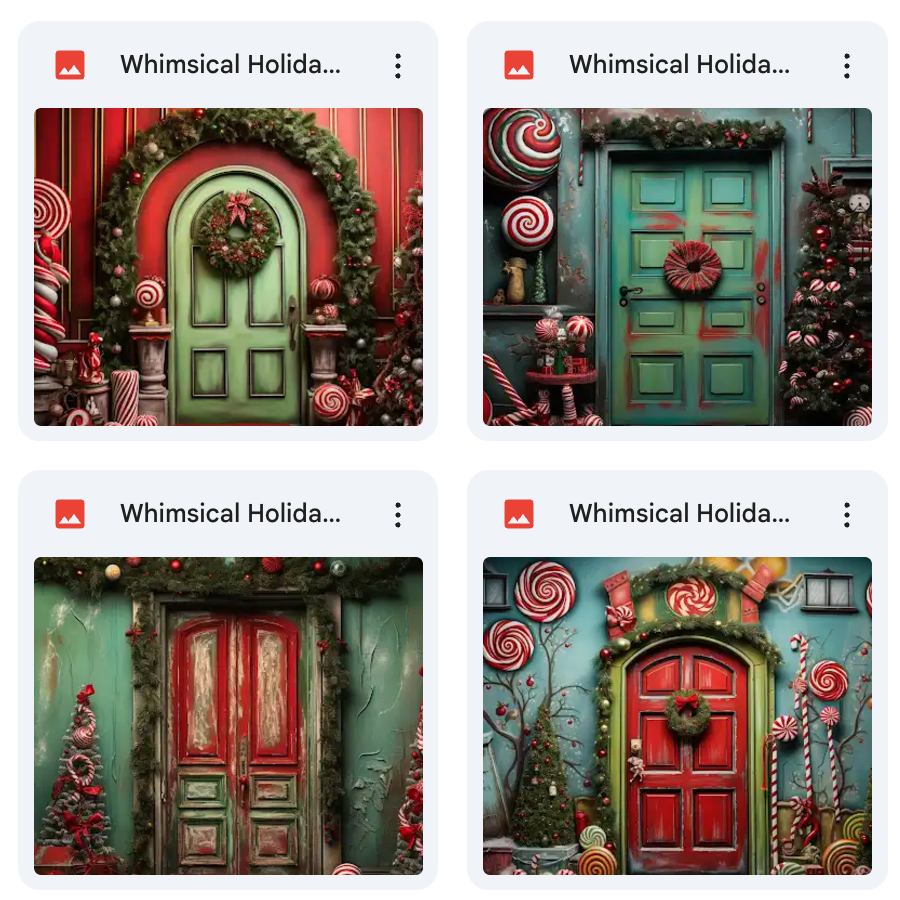 Transform your seasonal photo shoots with the Whimsical Holiday Door Background Bundle. This collection features 9 high-quality digital backgrounds designed specifically for photographers looking to add a festive touch to their work. Each backdrop is crafted with vibrant colors and intricate details to bring imagination and holiday cheer to your projects, ensuring every photograph captures the magic of the season.