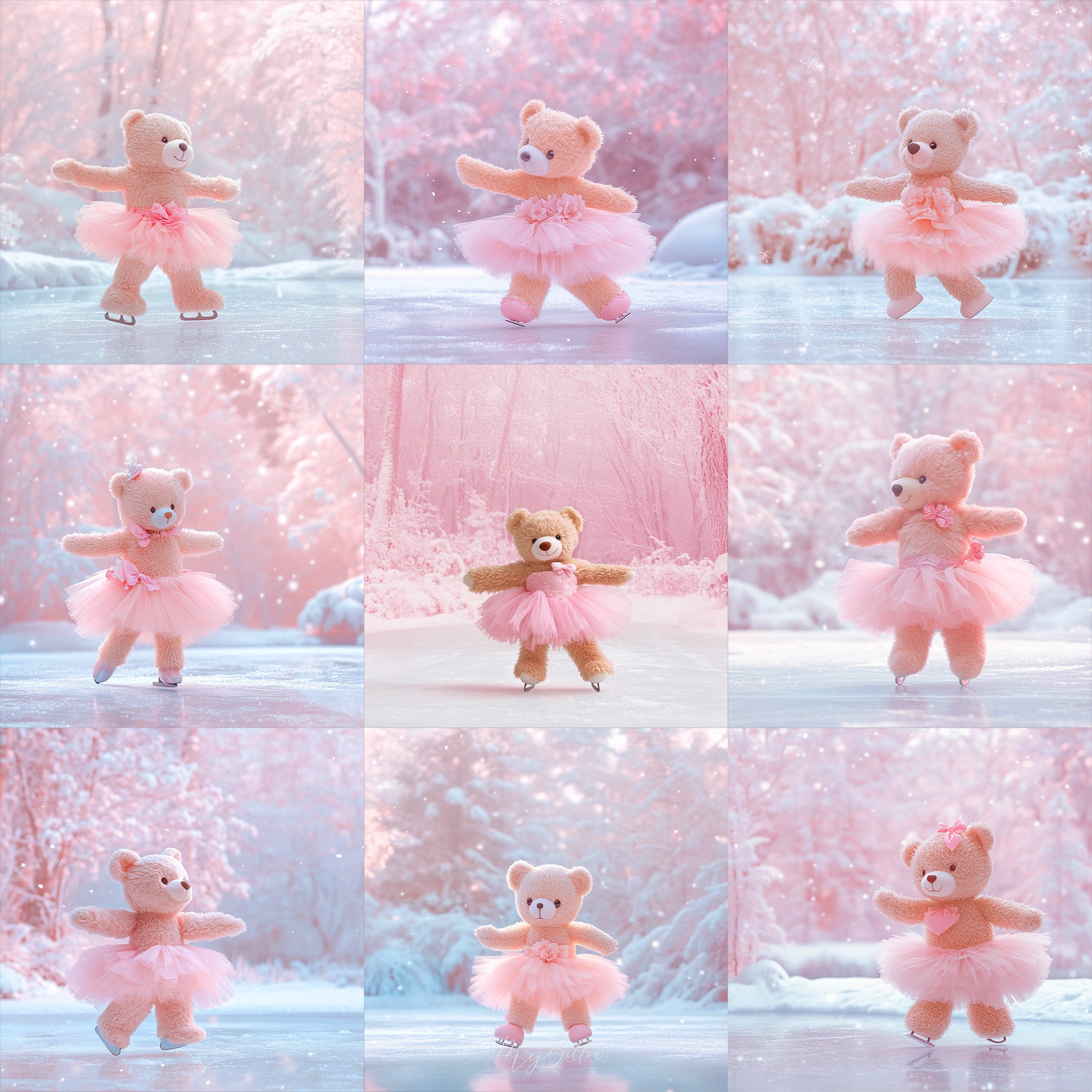 9 Unique Backgrounds: Each background showcases whimsical ice skating teddy bears in beautifully crafted winter settings.
